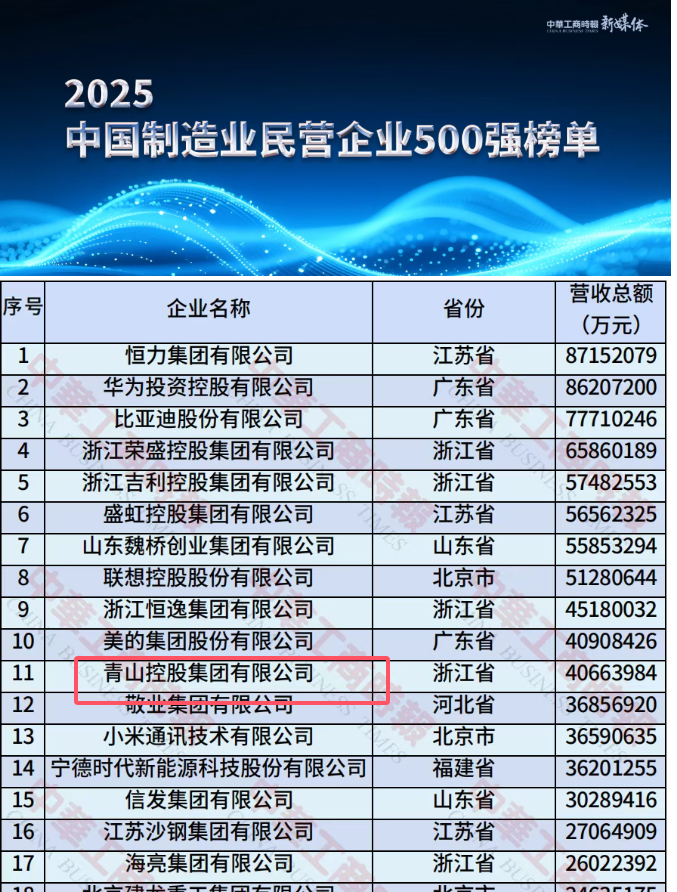 青山、振石、宏旺、甬金等上榜“2025中國民營企業(yè)500強(qiáng)”